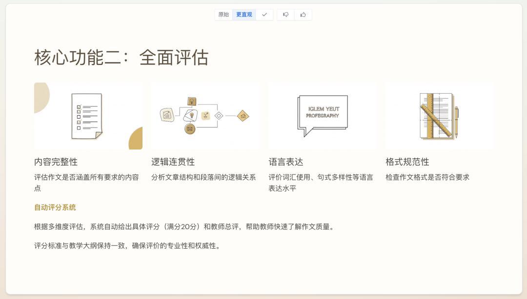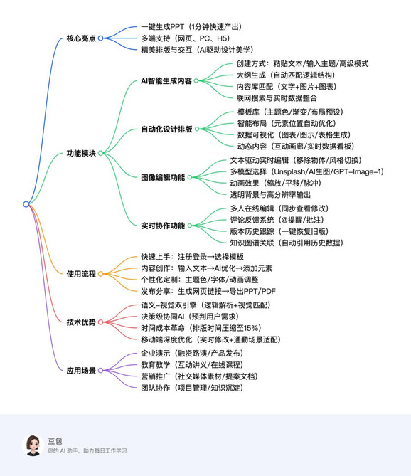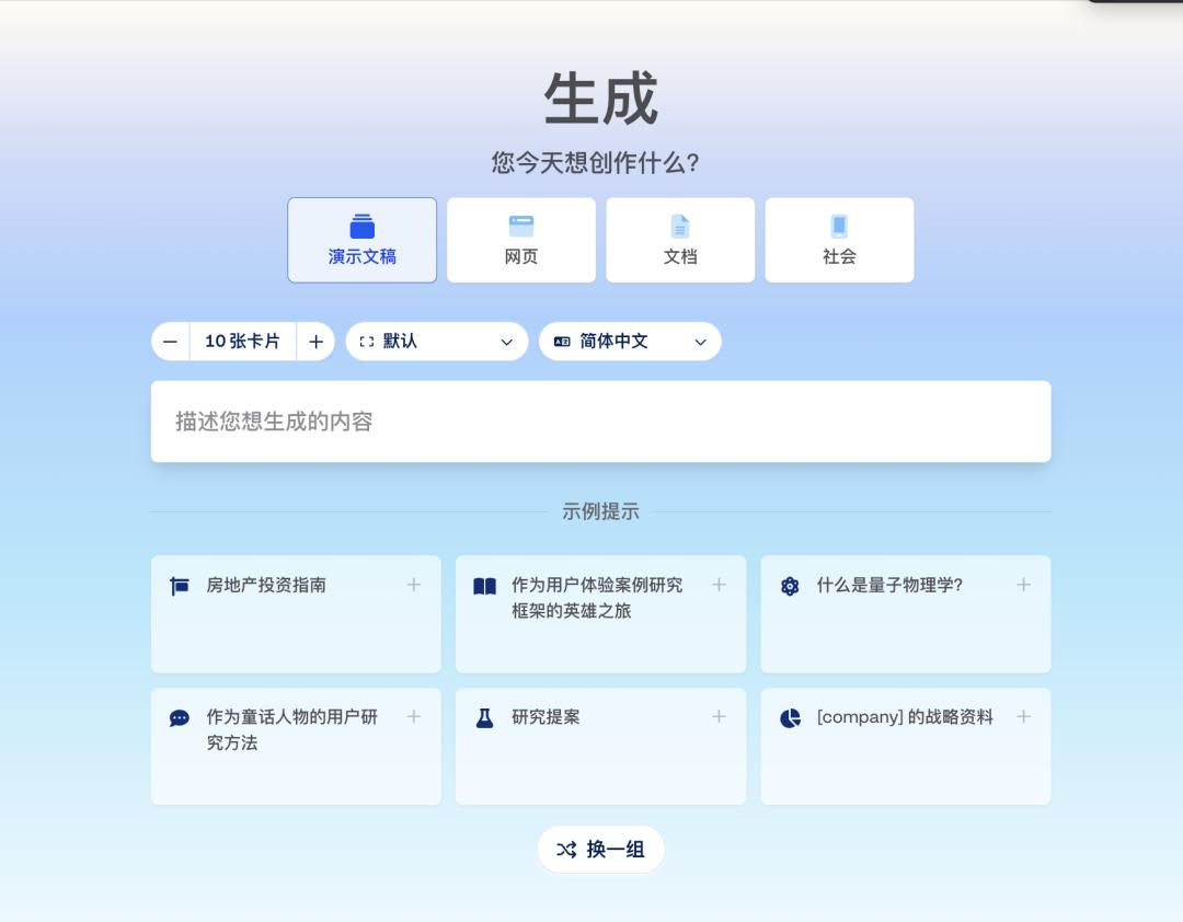 Gamma只需用户输入主题或简单描述,就能瞬间生成完整 PPT 大纲,并从丰富内容库中匹配文字、图片、图表,一键生成契合主题的素材 。