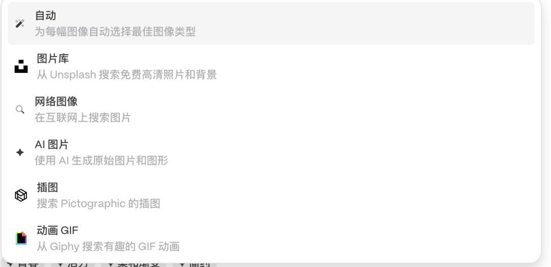 里面有Unsplash的图库 网络搜索 AI生图(这里多种模型可以选)插图 动画GIF,以前office的配图我觉得总不够多不够有意思,但是我亲测gamma的配图样式漂亮 和主题色相近(审美强迫症)还有就是非常优雅的布局,感觉又要忍不住剧透了。
