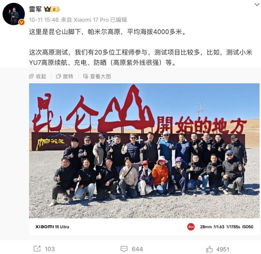 近日,小米创办人、董事长兼 CEO 雷军在社交媒体上表示,他已抵达新疆塔县,参与小米汽车的高原测试。这引发了网友的猜测,认为雷军可能是在亲自测试小米的第三款车。随后雷军补充,测试地在帕米尔高原,平均海拔 4000 多米,20 多位工程师参与,含小米 YU7 的高原续航、充电及防晒测试。