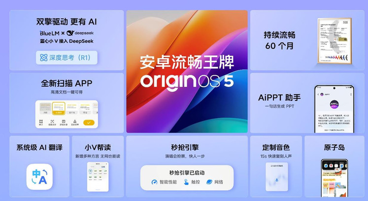 系统方面,OriginOS 5的蓝心小V融合DeepSeek,支持填表助手、旅行助手、AiPPT助手、应用通话录音、AI证件照和秒抢引擎等功能。