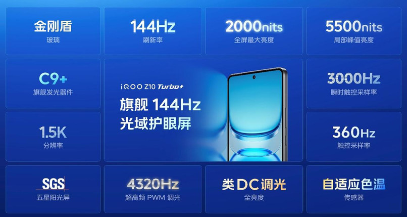 显示方面,iQOO Z10 Turbo+屏幕采用了华星旗舰C9+发光器件,基于三重锁电技术实现屏幕功耗降低,兼顾2000nit全局最大亮度和4400nit 25% APL局部峰值亮度。
