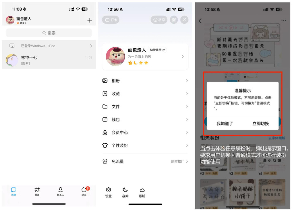 简洁模式下,产品整体框架未发生变化,但对于色彩的使用更加谨慎,主要以黑白灰三色为主,并默认无法进行各类装扮功能。