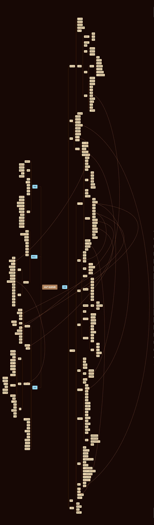 QQ体量庞大,如下所示,功能架构一共有四大模块,分别为消息、频道、联系人、动态,各个模块之间相互连接,其中消息模块最为核心。