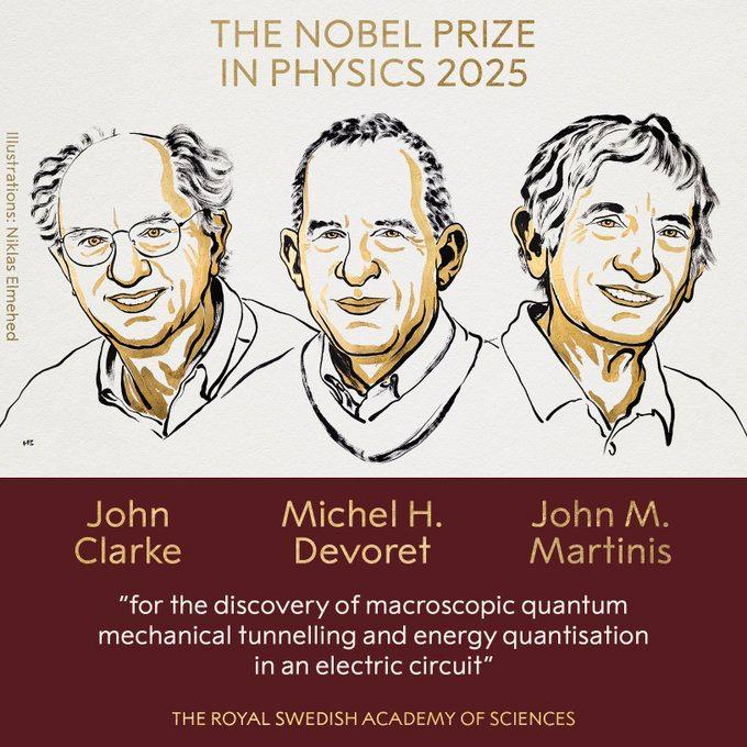 当地时间 10 月 7 日,瑞典皇家科学院将 2025 年诺贝尔物理学奖授予约翰·克拉克(John Clarke)、米歇尔·H·德沃雷特(Michel H.Devoret)和约翰·M·马丁尼斯(John M.Martinis),以表彰他们「发现电路中的宏观量子力学隧道效应和能量量子化」,获奖者将平分 1100 万瑞典克朗(约合 836 万元人民币)奖金。