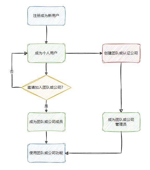 平台账号模式是指租户的用户实际上是在平台注册,然后再与某些租户绑定。这种通常出现在产品同时对企业用户和个人用户开放的情况,比如钉钉、飞书。个人用户可以直接通过平台侧注册,注册后成为个人用户,可以使用一些面向个人的功能。如果要使用团队、企业相关的功能,要么是被邀请加入团队或公司,要么需要用户自己创建团队或进行企业认证。整个账号的变化流程如下图所示。
