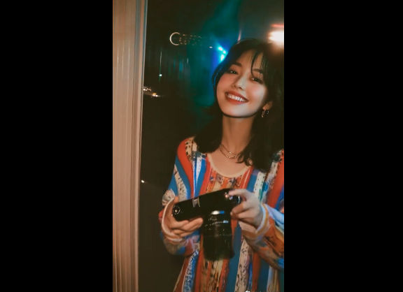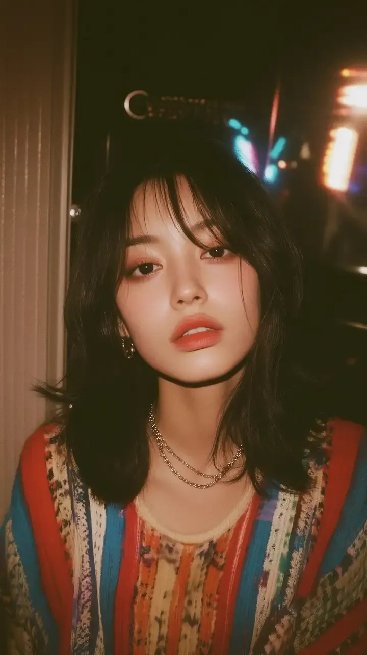 Prompt:复古胶片质感的视频片段,一位穿着鲜艳彩色条纹毛衣的女性成为焦点,她的黑色秀发自然垂落,银色项链与耳环在柔和灯光下闪烁。背景是朦胧的城市夜景,霓虹灯与街灯交织出梦幻般的氛围。女性脸上挂着温暖的笑容,她拿起复古相机,对着镜头捕捉这一刻的美好,眼神中透露出对生活的热爱与满足。中景,平视视角,女性的动作流畅自然,仿佛在讲述一段属于自己的故事。