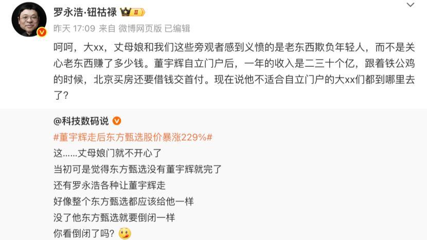 这不由得他不亲自回应。罗永浩曝出的收入和买房等细节,绝大多数消费者都会将董宇辉这类带货主播的赚钱速度,和直播带货乱象关联在一起,认为他们是“昧着良心赚钱”,最后还会被反问,“找找自己的原因,你努力了吗?”
