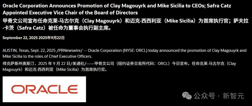 【新智元导读】昨天,甲骨文突然宣布换帅!本月初刚去白宫参加闭门晚宴的CEO Safra Catz卸任,接任者是甲骨文云基础设施总裁Clay Magouyrk和甲骨文行业总裁Mike Sicilia。埃里森下定了决心,All in AI。