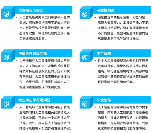 人工智能技术正以前所未有的速度迭代,其为银行业金融机构智能化转型提供了强有力支持的同时亦带来了不容忽视的风险,其表现形式包括但不限于: