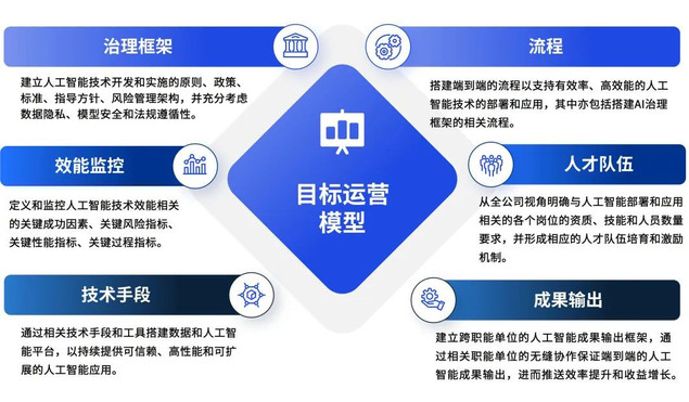 全面深入诊断机构内部人工智能的当前应用状况,定位差距的基础上设定目标和配置资源,并从战略落地角度明确各部门、各级机构在人工智能战略中的角色和责任,以落实责任并简化决策流程,同时应细化战略成功的衡量标准、战略实施的时间表,并与现有的公司流程和公认的标准保持一致。