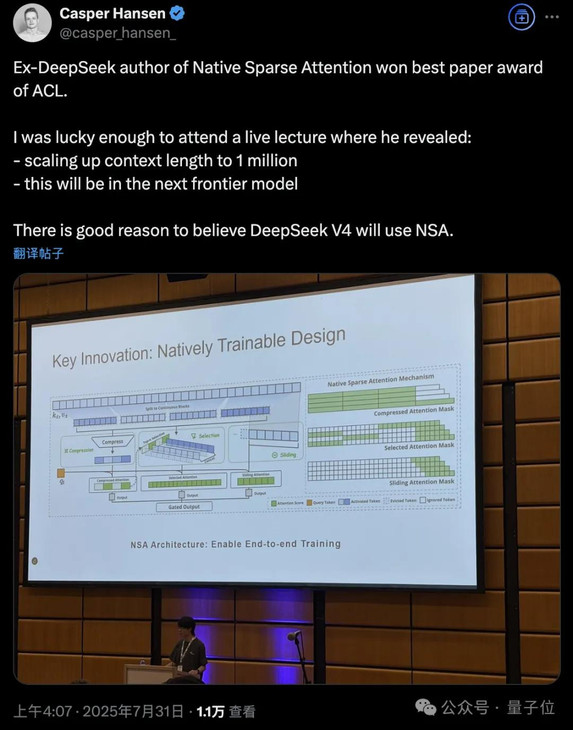 在ACL 2025的颁奖典礼上,由DeepSeek梁文锋作为通讯作者、与北京大学等联合发表的论文荣获最佳论文奖。