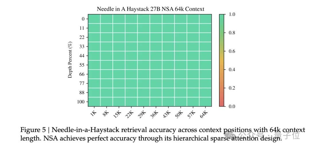 长文本处理能力的测试结果更是亮眼。在64k上下文的”大海捞针”测试中,NSA在所有位置都实现了完美的检索准确率。在LongBench基准测试上,NSA取得了0.469的平均分,不仅超越了全注意力基线(+0.032),更是大幅领先其他稀疏注意力方法。