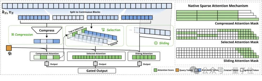 NSA采用了一种动态分层的稀疏策略,通过三条并行的注意力分支协同工作: