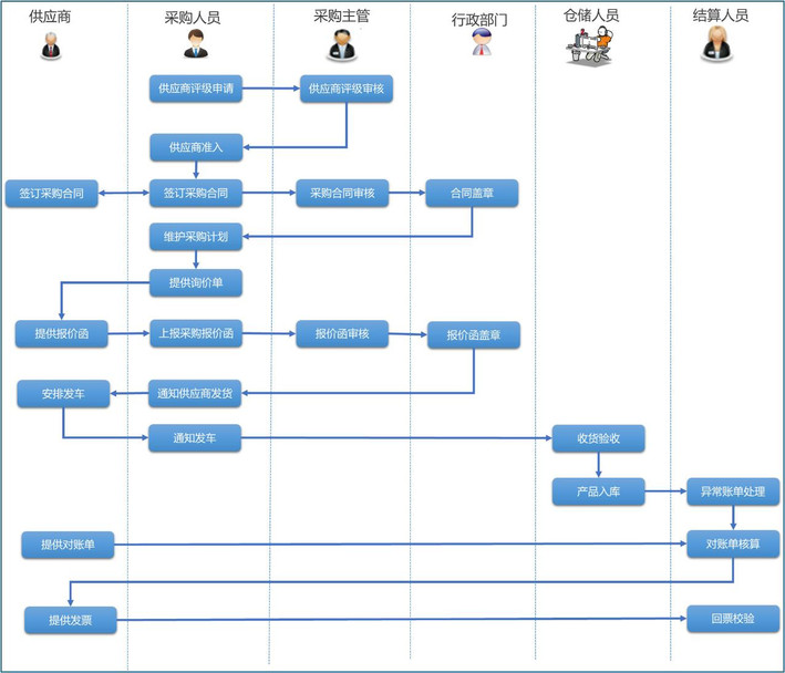 - 供应商提供报价函,采购经理提交报价函,在采购主管审批通过之后,由行政部门进行报价函盖章;