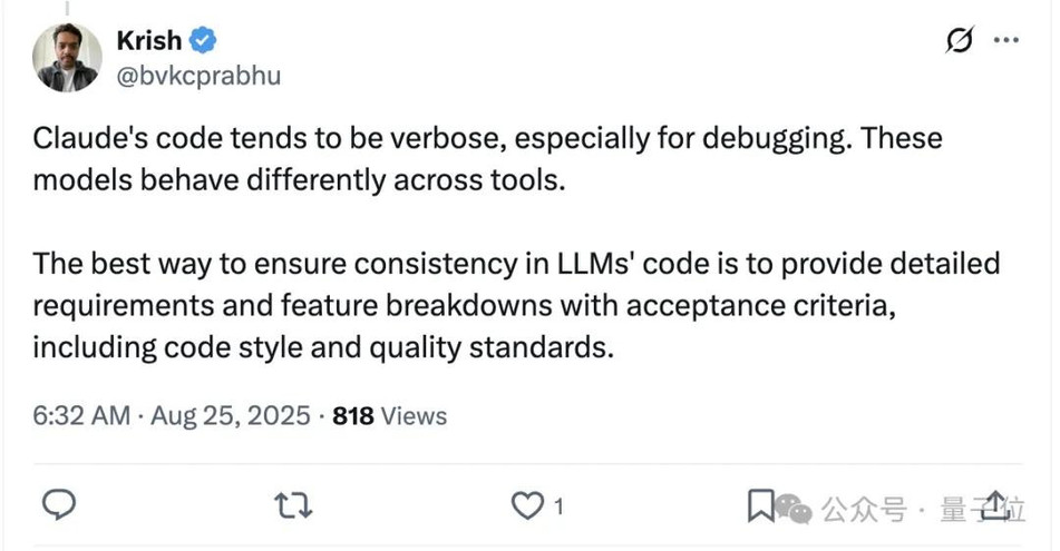 其他网友也是晒出了自己的心得:确保LLM生成代码一致性的最好方法是提供详细的需求说明和功能拆解,同时附上验收标准,包括代码风格和质量规范。