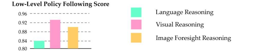 我们可以观察到,基于视觉的规划表示(包括视觉规划与图像前瞻规划)更易于被底层策略所跟随,表现出更高的策略可执行性。