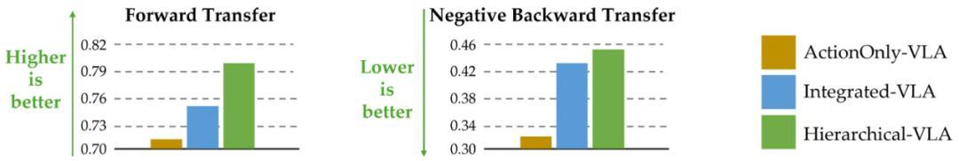 发现 13:相比不含任务规划的范式(ActionOnly-VLA),包含任务规划的 VLA 范式(Integrated-VLA 与 Hierarchical-VLA)在前向迁移能力上更强,但遗忘速度也更快。
