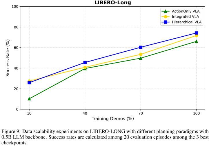 我们可以看到,所有 VLA 范式均具备良好的数据可扩展性,随着标注动作示范数据量的增加,其性能稳步提升。