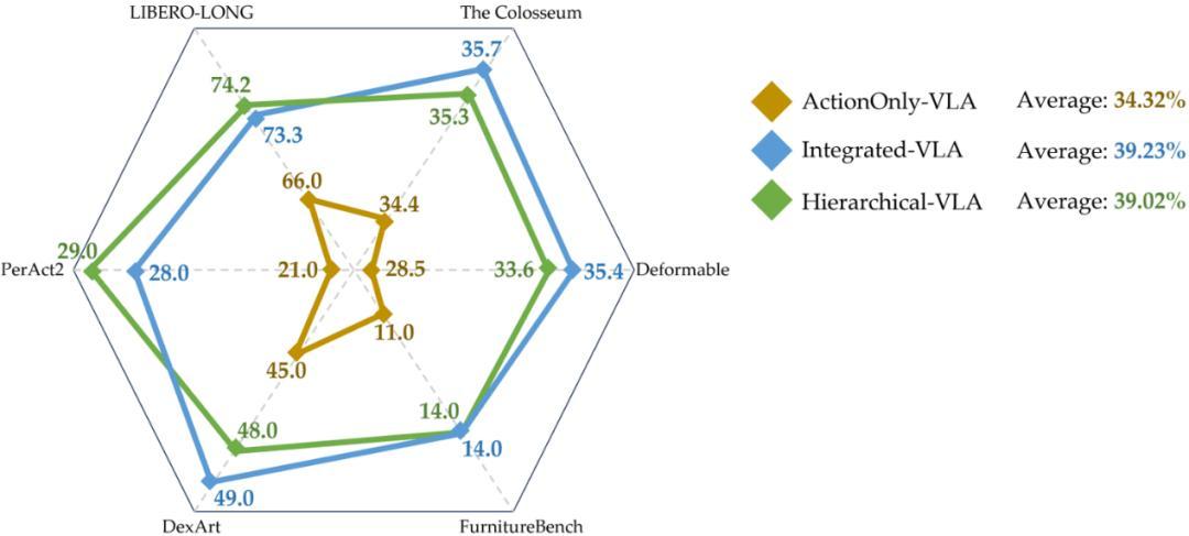 发现 5:Integrated-VLA 与 Hierarchical-VLA 在二维、三维、仿真及真实环境等多种任务中均显著优于 ActionOnly-VLA,且两者整体性能相近。