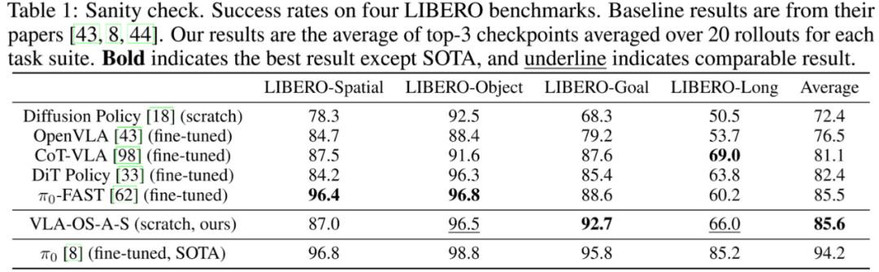 尽管本模型尚不及当前最先进(SOTA)的一些方法,但上述结果已充分表明我们模型的设计具有良好的性能和竞争力。需特别指出的是,VLA-OS-A 是在无预训练的条件下从头开始训练的,并仅使用了参数规模为 0.5B 的语言模型作为骨干网络。
