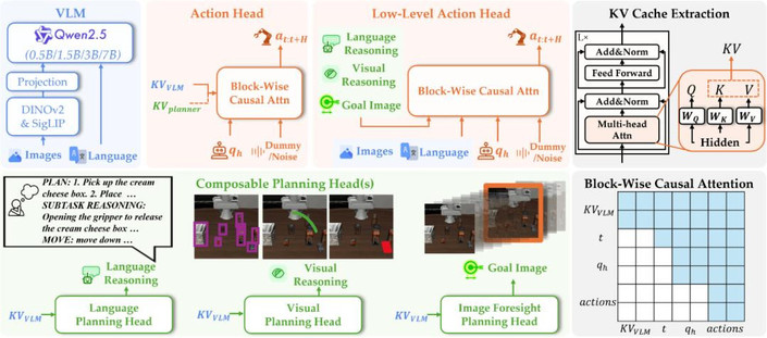 然后,我们针对三个 VLA 的任务规划范式,设计了可组合的 VLA-OS 模型家族,首次实现三大范式的公平对比。我们设计了统一的动作头(action head)和推理头(planning head),使用统一的 KV Cache 提取方法来将 VLM 中的信息输入给各个头。如图 7 所示。