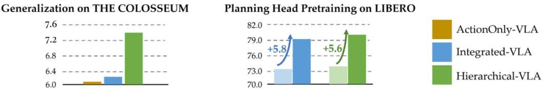 发现 6:Integrated-VLA 与 Hierarchical-VLA 在任务规划预训练中均表现出相似的收益,任务成功率均有所提升,增幅相近。