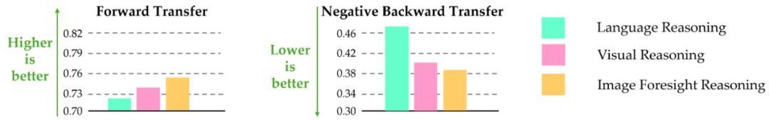 发现 14:相较于基于语言的规划表示,基于视觉的规划表示在持续学习中展现出更优的前向迁移能力,且遗忘速度更慢。
