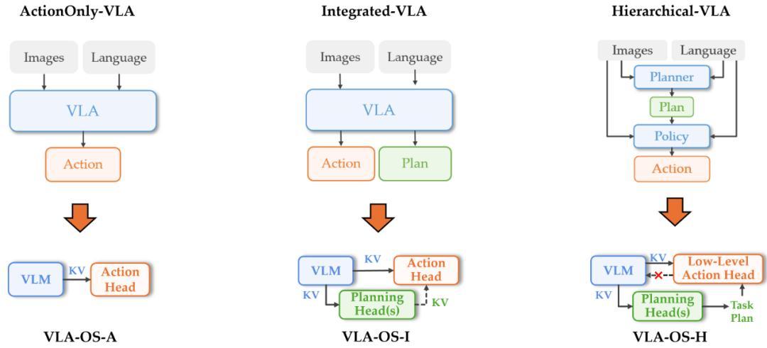 图 8 VLA-OS 研究的三种 VLA 范式和对应的网络实现