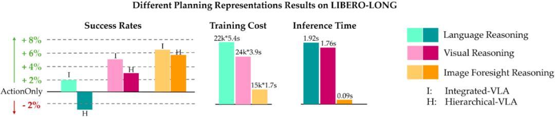 发现 3:相较于语言规划表示,基于视觉的规划表示(视觉规划和目标图像规划)在性能上表现更优,且具有更快的推理速度与更低的训练成本。