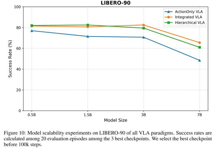 我们可以观察到,随着模型规模的增大,各种 VLA 范式的性能并未随之提升,反而在模型规模超过 3B 时出现下降的趋势。