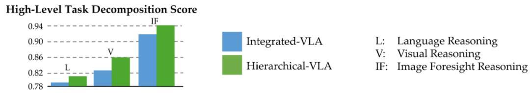 我们可以观察到,在不同的规划表示下,Hierarchical-VLA 在任务规划方面始终优于 Integrated-VLA,表现出更强的规划能力。