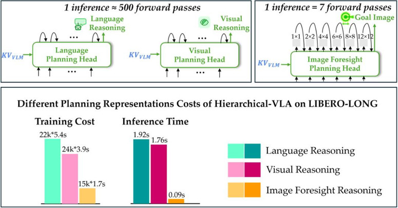 由于语言规划头与视觉规划头具备自回归特性,它们在生成规划 token 时需进行数百次前向传播,导致训练成本较高、推理速度较慢;而图像前瞻规划头(本工作中采用类似 VAR 的生成器)仅需前向传播 7 次即可生成完整的规划 token,推理开销大约是语言与视觉规划头的 1/100,显著更高效。