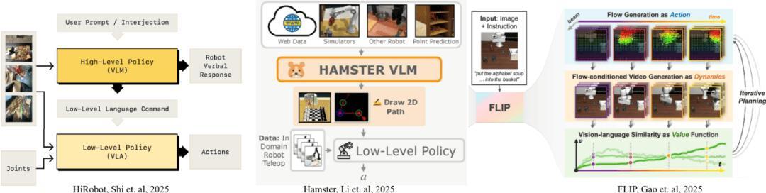 - 使用分层的范式(Hierarchical-VLA), 即一个上层模型负责任务规划,另一个下层模型负责策略学习,二者之间没有梯度回传。例如,Hi-Robot 使用一个 VLM 输出任务分解后的简单语言规划指令,然后用一个 VLA 接收分解好的语言指令进行动作。图 4 展示了一些代表性工作: