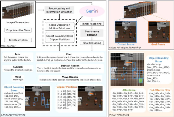 来表示从左上到右下的第 i 个网格。我们使用这种位置标记对所有物体的边界框、末端执行器位置流和目标物体可供性这三种表征作为视觉规划表示。例如,对于「Put the cream cheese box and the butter in the basket」,视觉规划表示的结果为: - VISUAL OBJECT BBOXES: alphabet soup [