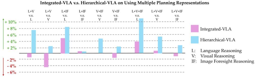 发现 4:在同时采用多种规划表示的情况下,Hierarchical-VLA 相较于 Integrated-VLA 范式表现出更优的性能。