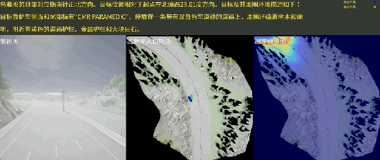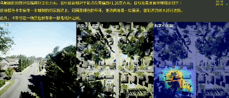 如下三张图分别从“前视图、高低无人机轨迹、概率预测图”角度,展示此方案如何工作: