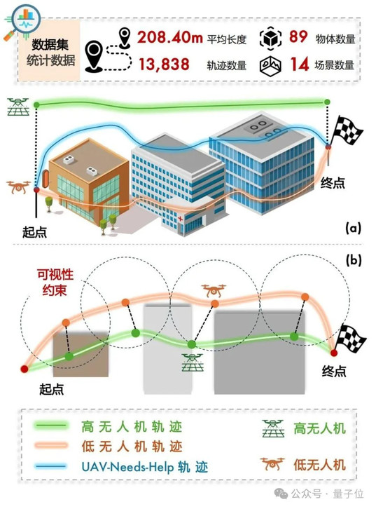 考虑到UAV-Need-Help数据集中仅包含单无人机信息,研究团队在此基础上补充采集了高空无人机的轨迹与感知数据,并优化部分原始轨迹,构建出HaL-13k数据集。数据集构建示意图如下: