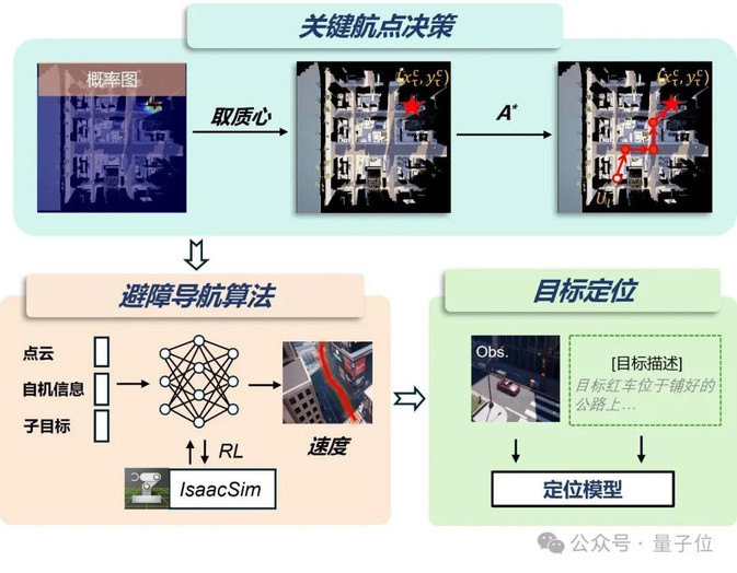 低空无人机采用三阶段导航搜索策略:首先,根据高空无人机的预测概率图选取高置信度区域的质心作为导航目标并结合A*算法规划关键航点;随后,利用基于强化学习的避障策略,实现安全灵活的路径执行;最后,通过视觉语言模型进行目标检测与定位。