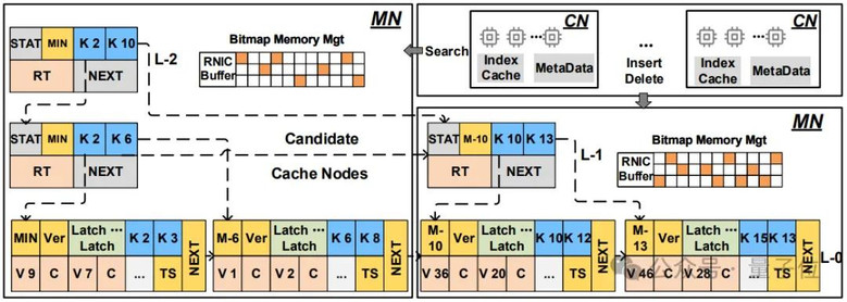 采用分离式存储,Key在内存中连续存放,value则与校验和在另一内存块连续存储;连续键数组可一次性加载至SIMD寄存器,大幅提升查找速度;优化读写操作序列,避免多次RDMA读写指令。