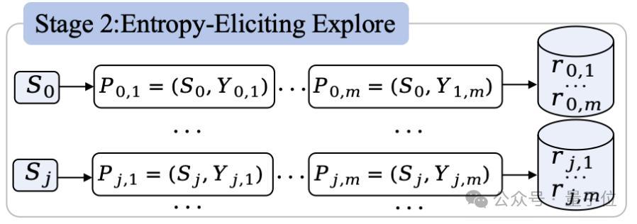 在该阶段,模型对每条prompt进行多次rollout,自由探索可能的解题路径,并收集相应的轨迹及其奖励信号。