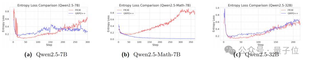 尤其值得注意的是,在训练动态分析中,FR3E展现出更持久的探索行为:其熵值衰减更缓慢,响应长度更长,特别是在Qwen2.5-Math-7B这类已微调模型上,成功突破了传统方法中熵值长期处于低位的“僵化”困境,实现了探索能力的再激活。