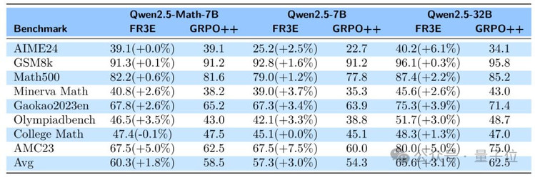 为全面评估FR3E的有效性,团队在多个权威数学推理基准上进行了实验,包括GSM8K、Math500、Minerva Math、Gaokao2023en、OlympiadBench、College Math以及AIME24。并在Qwen2.5-7B、Qwen2.5-Math-7B和Qwen2.5-32B三种模型上进行了评测。