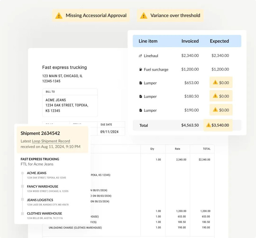 Loop把这个环节“AI化”了。它能自动识别各种格式的发票、凭证、费率表,把里面的关键数据提出来,快速和系统里的标准里程、费用去比对。如果发现有异常,比如多报了一笔附加费,它会自动标记出来。整个过程几乎是实时的,不用人反复对照。
