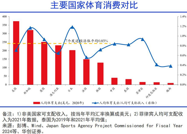 根据华创证券数据,2020年中国居民人均体育消费支出占可支配收入比例已达到0.84%,和发达国家平均水平相当,但由于整体收入规模、消费习惯方面还存在差距,人均支出仅相当于发达经济体的1/6。收入上的差距最终导致我国体育产业各环节的收益和欧美比均较低。