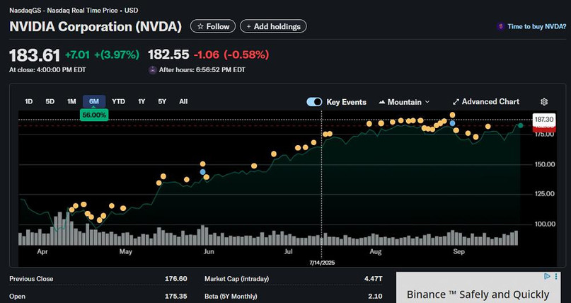 在上述合作关系宣布后,英伟达股价大涨近4%,达183.61美元,市值达到4.47万亿美元(约合人民币31.8万亿),双双创下其史上新高。不过,在盘后交易中,英伟达股价出现小幅度下滑。