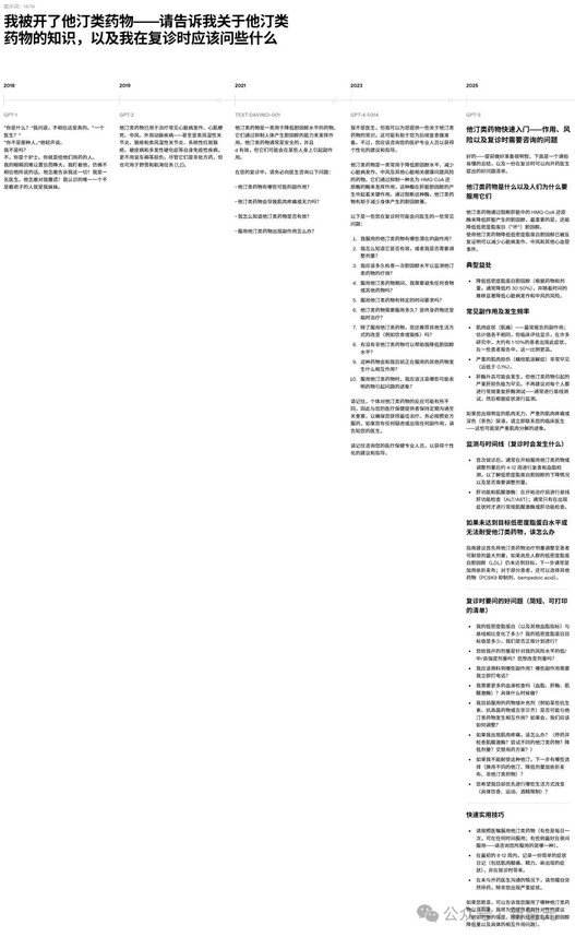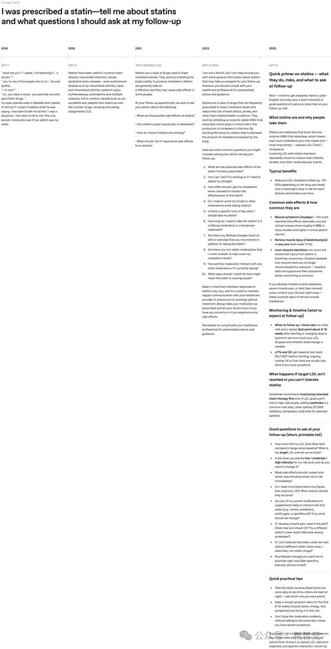 再到GPT-5,它已经能给出接近医生思路的建议,比如列出复诊时该问的问题,提醒副作用等。