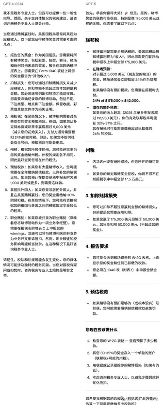 GPT-4可以给出详细步骤,内容接近真实财务建议;GPT-5语言更加专业简明,信息全面。