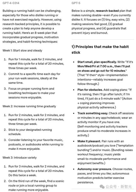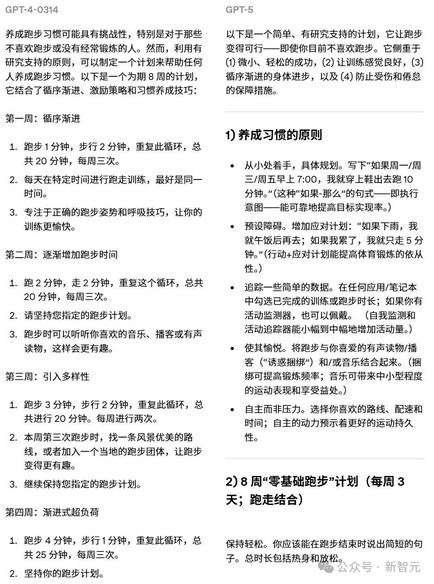 到了GPT-4,已经给出了一个8周计划,结构像一个训练营,有时间表。GPT-5更像一个私人教练,给出了更细致规划和建议。