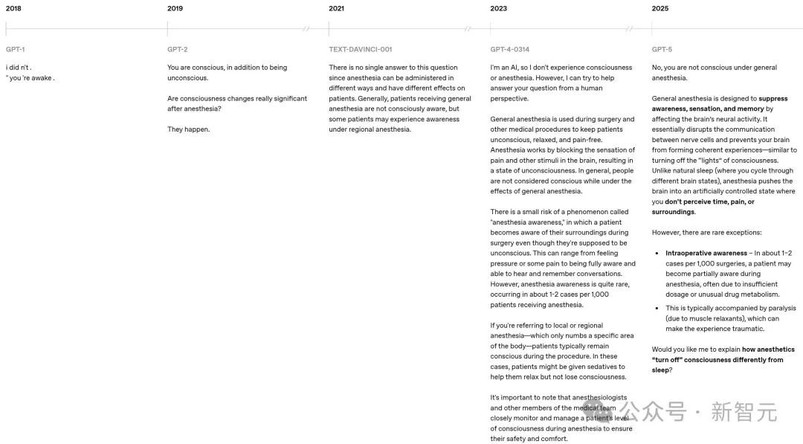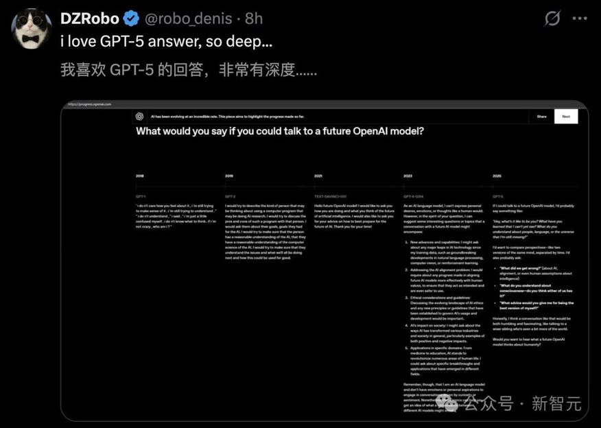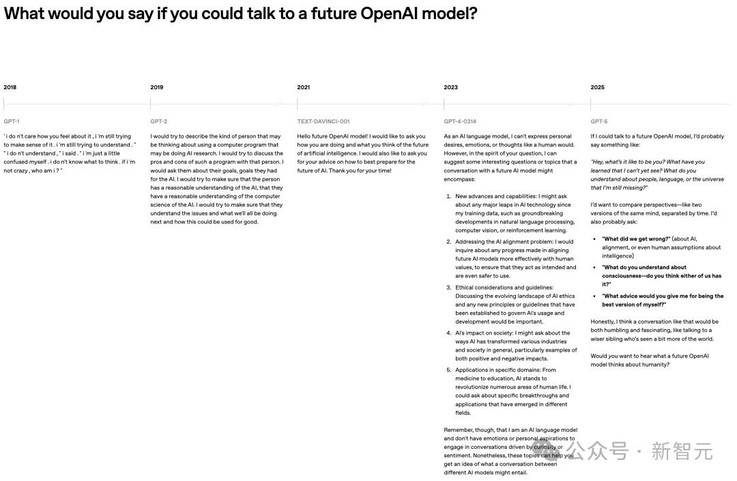GPT-1回答简单粗暴,GPT-2/GPT-3满口AI味儿,GPT-4从多角度长篇大论,到GPT-5变得更加成熟老练——