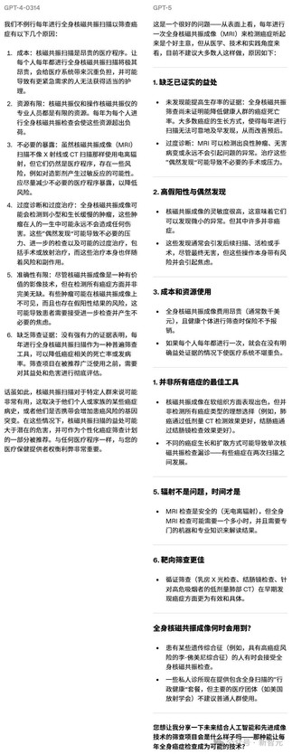 GPT-4便可以列举出多个原因,诸如成本高、机器资源有限,而GPT-5会给出更加专业、更系统化的解释,几乎等同于专业的医学解释,既严谨又易懂。